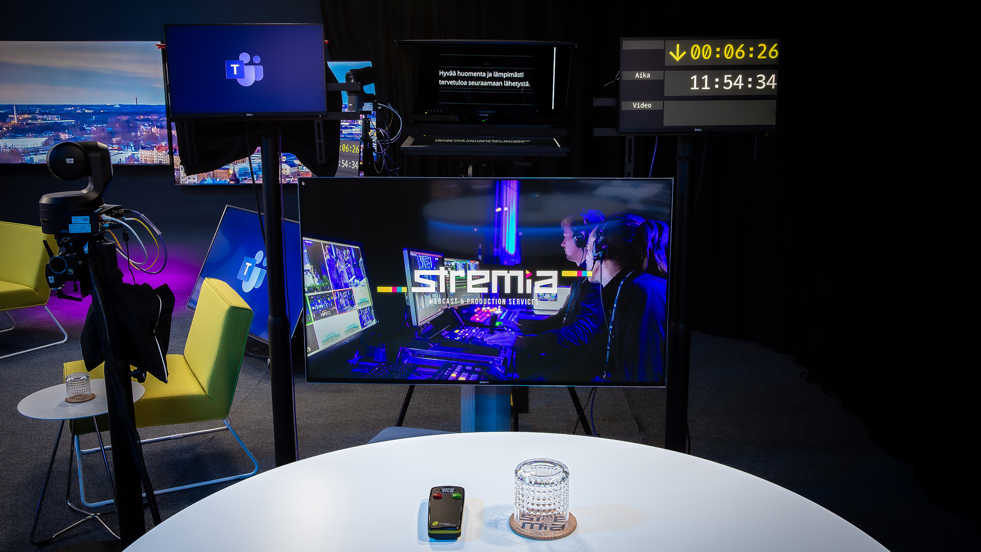 Studiopalvelut ja Stremian studio Helsingissä tarjoavat laadukkaan toteutuksen ja näyttävät puitteet erikokoisten virtuaalitapahtumien ja webinaarien toteuttamiseen. Studiollamme on valmiina huippuluokan tekniikka suoria lähetyksiä ja tallennekuvauksia varten. Lopputuloksesta huolehtii ammattitaitoinen ja kokenut henkilöstömme.